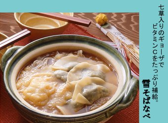 なべにだし汁を入れて煮たて、みりん、薄口しょうゆを加える。おろし大根を加え、再び煮たったところにそばを入れ、揚げもちとギョーザをのせる。