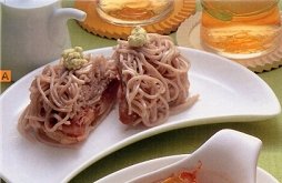 | A 鶏肉の信州蒸し ■材料 (1人分143kcal) ゆでそば・・・1玉 かたくり粉・・・大さじ1 塩・わさび・しょうゆ・・・各適量 鶏もも肉・・・1枚 酒・・・大さじ1 しょうが汁・・・大さじ1/2 ■作り方 1 鶏もも肉は4等分に切り、酒、しょうが汁をよくもみ込む。 2 そばは水でしめらせてからほぐし、かたくり粉をまぶす。 3 1に2をのせて耐熱皿におき、ラップをかけて電子レンジで8〜9分加熱する。2等分に切って器に盛り、わさびをのせ、しょうゆをかける。 |